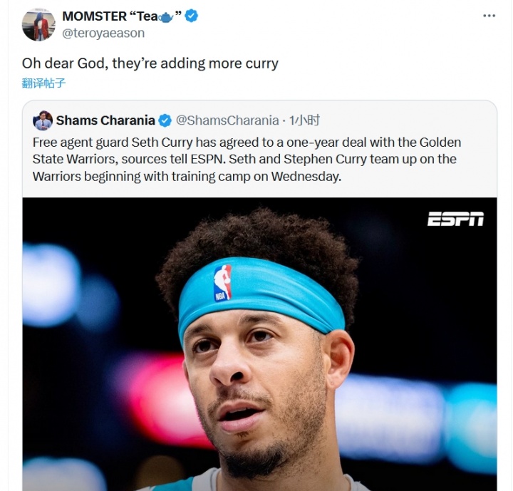 10月01日讯 据Shams报道,勇士用一年合同签下赛斯-库里。