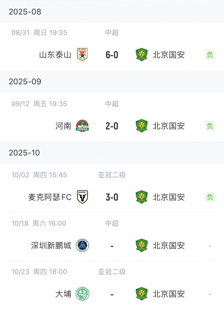 国安此前客场二连败:0-6山东泰山、0-2河南