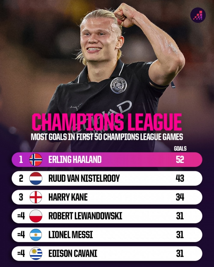 10月2日讯 Squawka统计了球员在前50场欧冠比赛中的进球数量,并列出榜单,哈兰德52球断层居首。