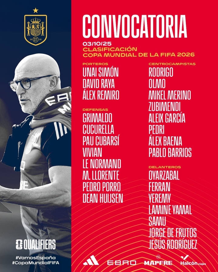 10月03日讯 西班牙队官方公布了最新一期的国家队大名单,亚马尔、佩德里领衔,苏维门迪、赫伊森等多人在列。卡瓦哈尔、费尔明等人因伤落选。这批球员将随西班牙出征10月份的两场世预赛欧洲区比赛。
