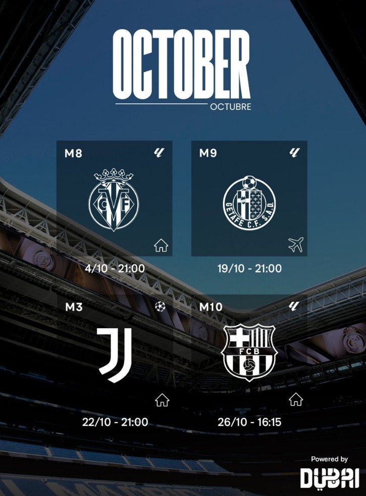 10月3日讯 皇马官推晒出了球队10月份赛程,其中与巴萨的国家德比最为引人瞩目,以下为具体情况(北京时间):