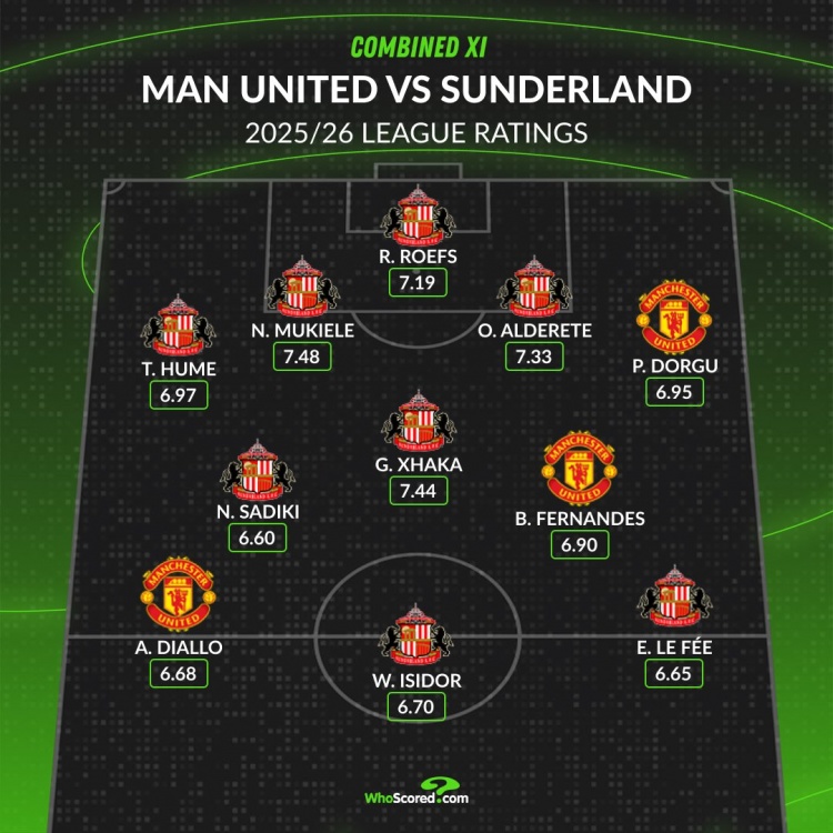 WhoScored排曼联+桑德兰阵容:曼联仅B费、多古、阿玛德三人在列