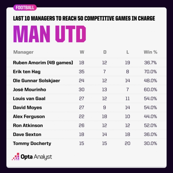对阵桑德兰的比赛将是阿莫林执教曼联的第50场比赛,但他的5位前任莫耶斯、范加尔、穆里尼奥、索尔斯克亚和滕哈赫,都没能在执教曼联的50场里程碑取得胜利。