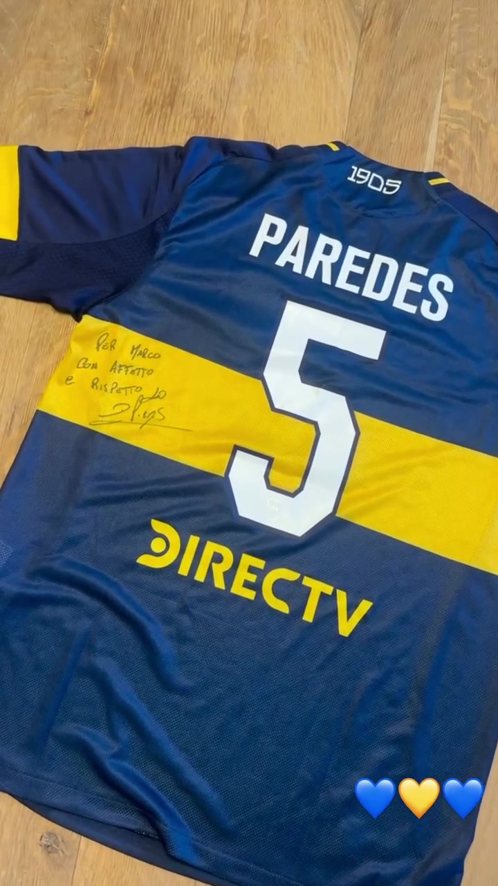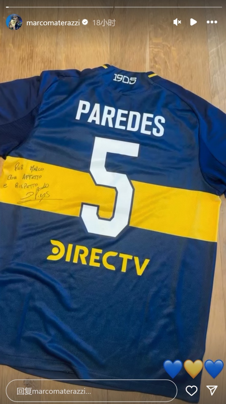 马特拉齐获赠帕雷德斯的博卡青年球衣、迪巴拉的阿根廷球衣,他在社交媒体上晒出球衣的视频,对两人表示感谢。
