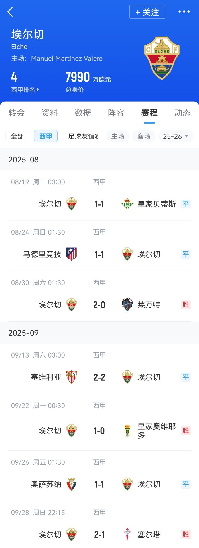不过,埃尔切的开局不败似乎也与赛程有关:他们至今并未遭遇太多强队,仅在第二轮与马竞1-1战平。11月初将进行的西甲第11轮,他们将客场挑战巴萨。