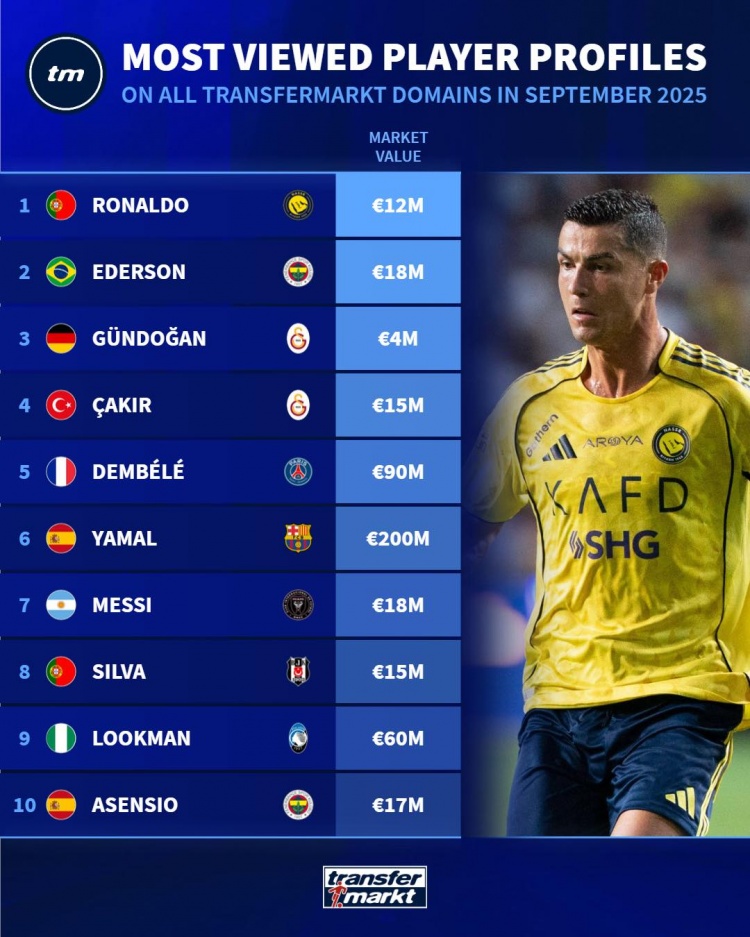 10月5日讯 德国转会市场列出了9月份球员页面浏览量排名,C罗居首,埃德森、京多安二三位,梅西排名第7位。