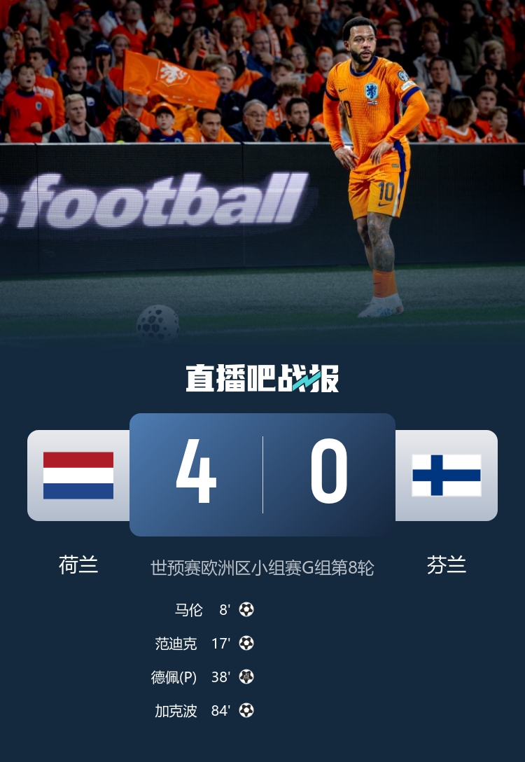 德佩点射+助攻双响,马伦世界波,范迪克、加克波建功;荷兰6轮不败领跑G组。