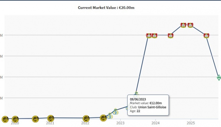10月14日讯 德转更新球员身价,24岁前锋博尼法斯从4000万欧跌至2000万欧。