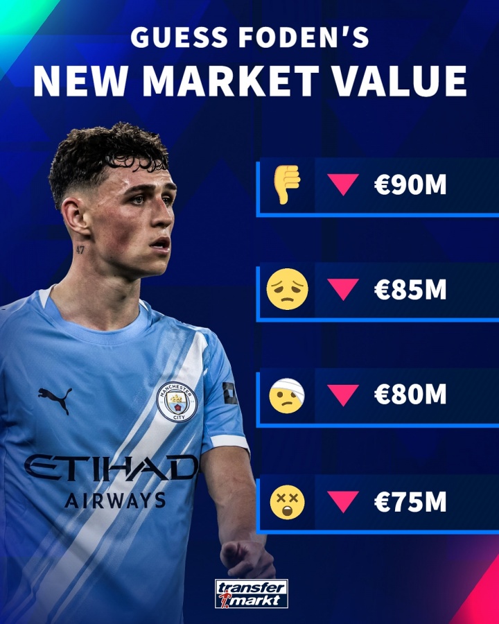 10月16日讯 明日德转将更新英超球员身价,德转官方社媒今日发图预热福登身价变化,球员身价必定下跌,最多跌至7500万。