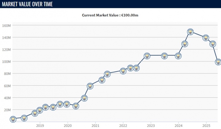 值得一提的是,这将是福登连续四次德转身价更新后身价下跌,在2024年,福登身价曾一度达到巅峰的1.5亿欧元,但最近几次身价更新,福登目前身价已经为1亿欧元,这也意味着足坛德转身价上亿球员又要减少一位。